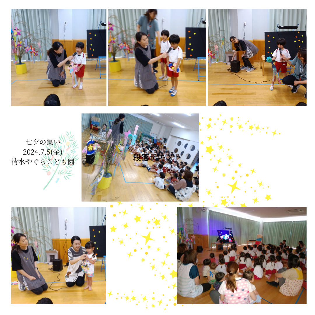 前に出て各クラスの製作をした七夕飾りを説明した子どもたち